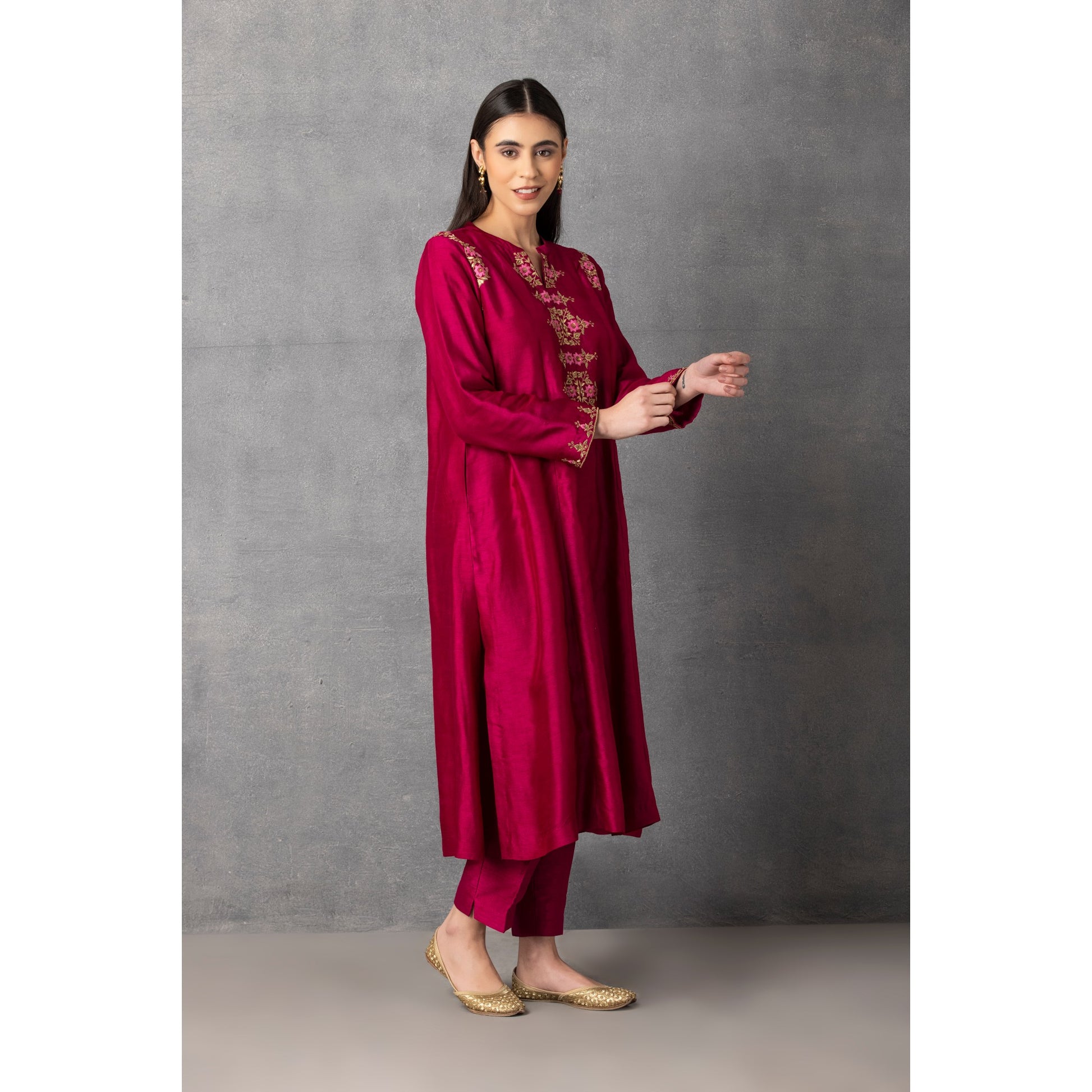 FALSA VISCOSE DUPION EMBROIDERED A-LINE KURTA WITH AN ENSEMBLE OF SEQUIN, RESHAM AND DABKA, TEAMED UP WITH MATCHING PANTS