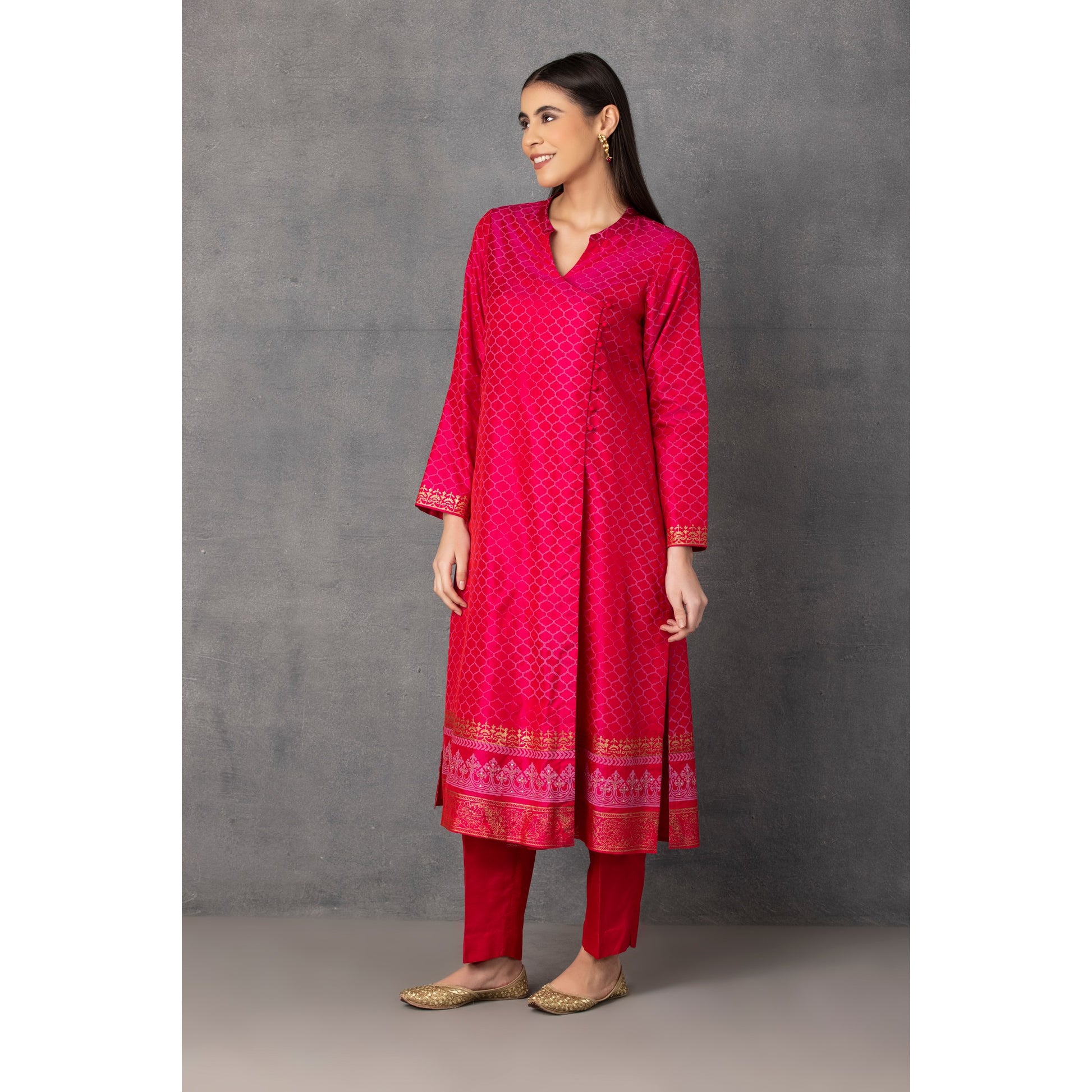 HOT PINK PURE SILK WITH GOLDEN KHADI PRINT & ZARI SEQUIN EMBROIDERED ANGRAKHA KURTA TEAMED UP WITH SILK PANTS AND SILK CRINKLE DUPATTA.
