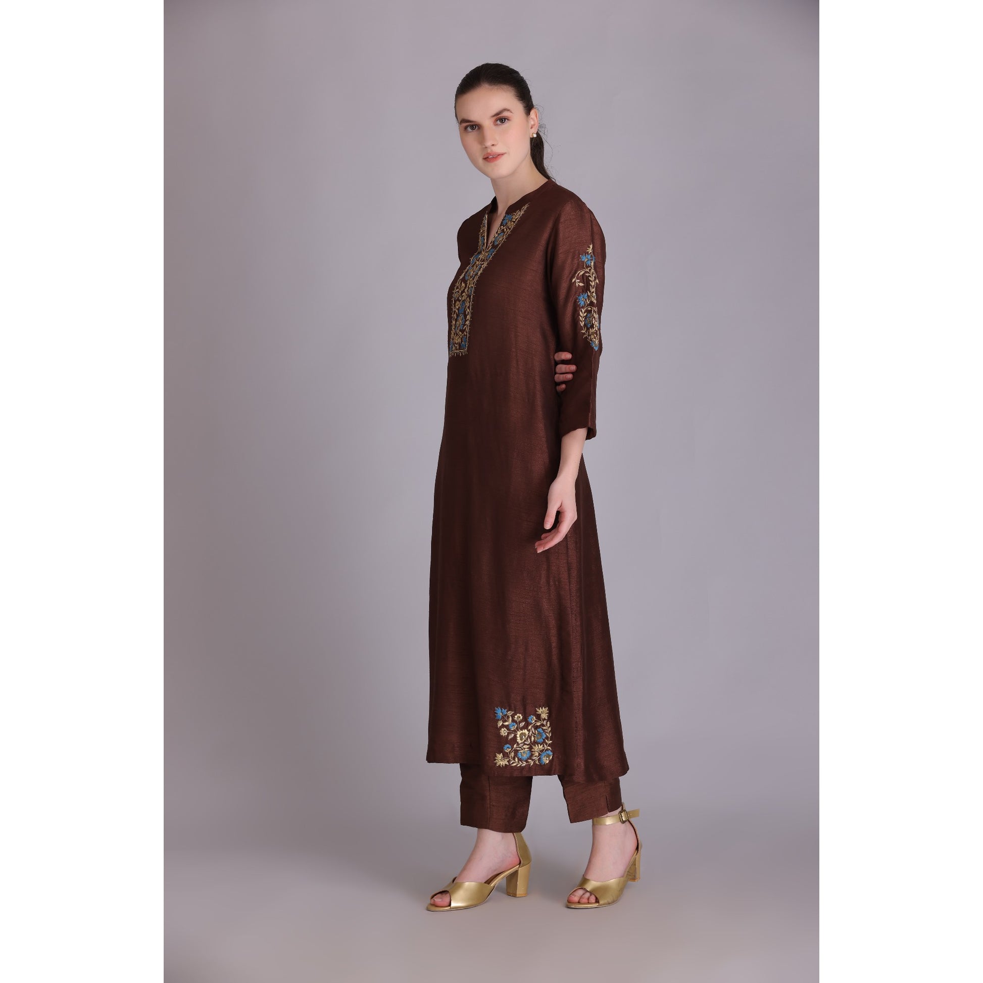 BROWN EMBROIDERED KURTA WITH AN ENSEMBLE OF SEQUINS, RESHAM, AND DABKA. TEAMED UP WITH MATCHING PANTS.