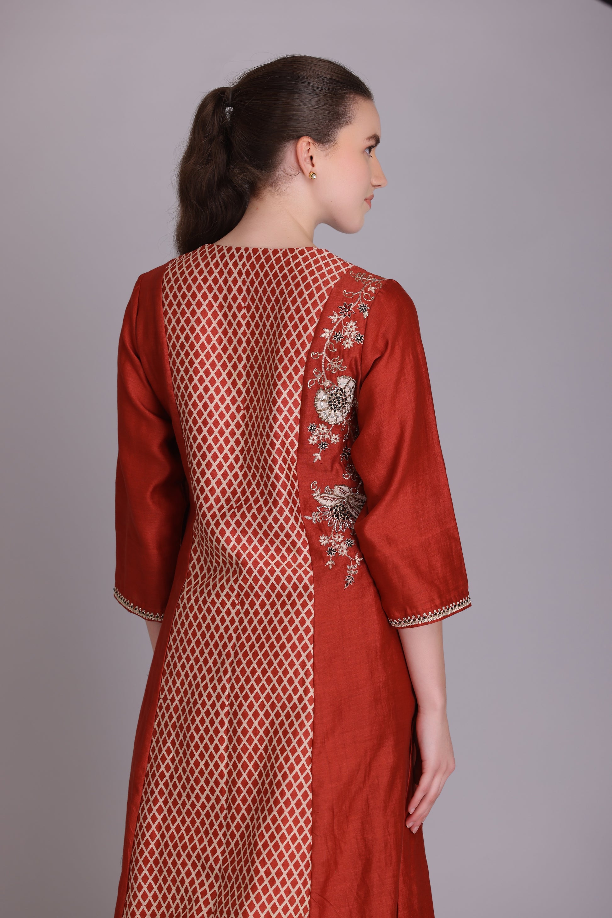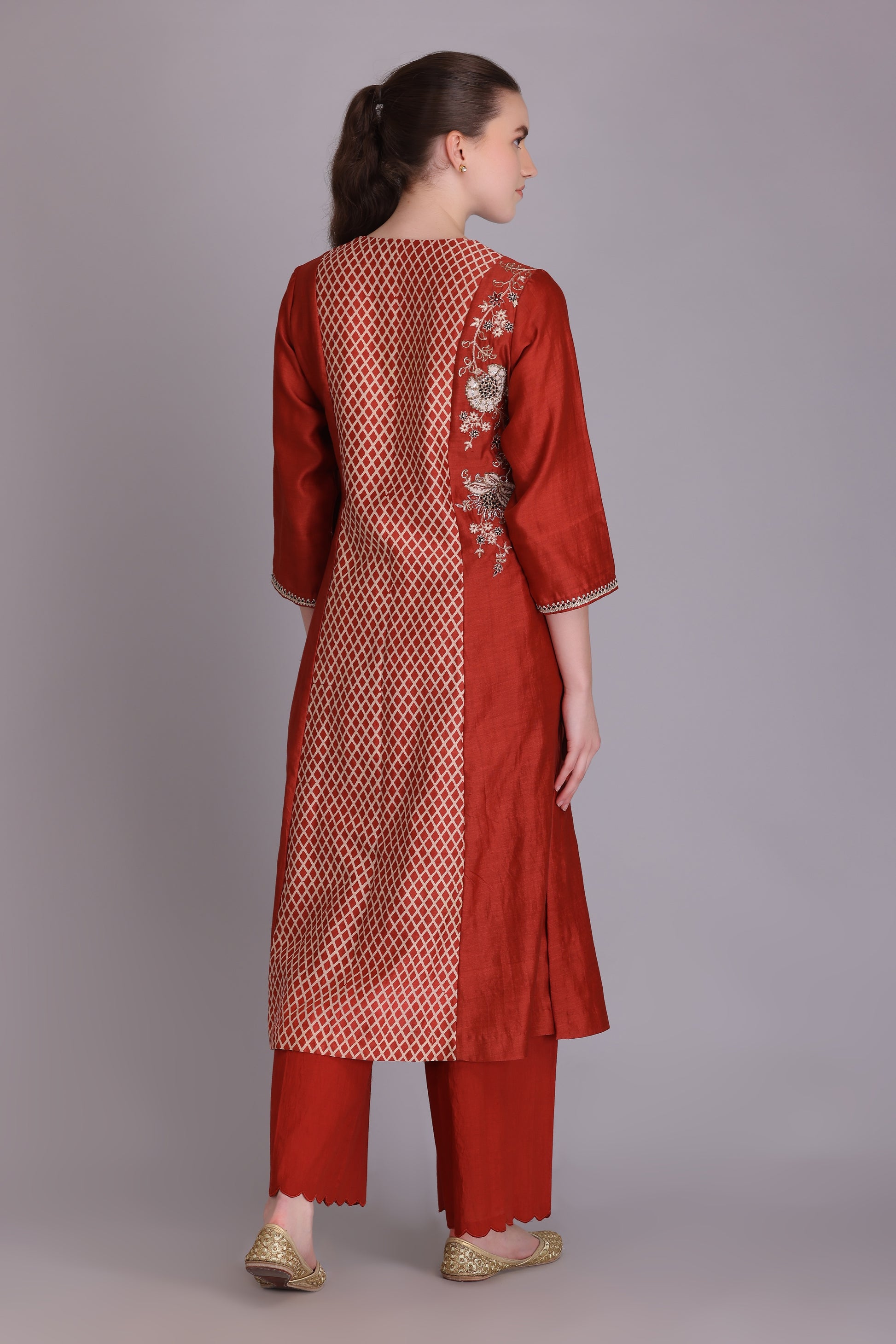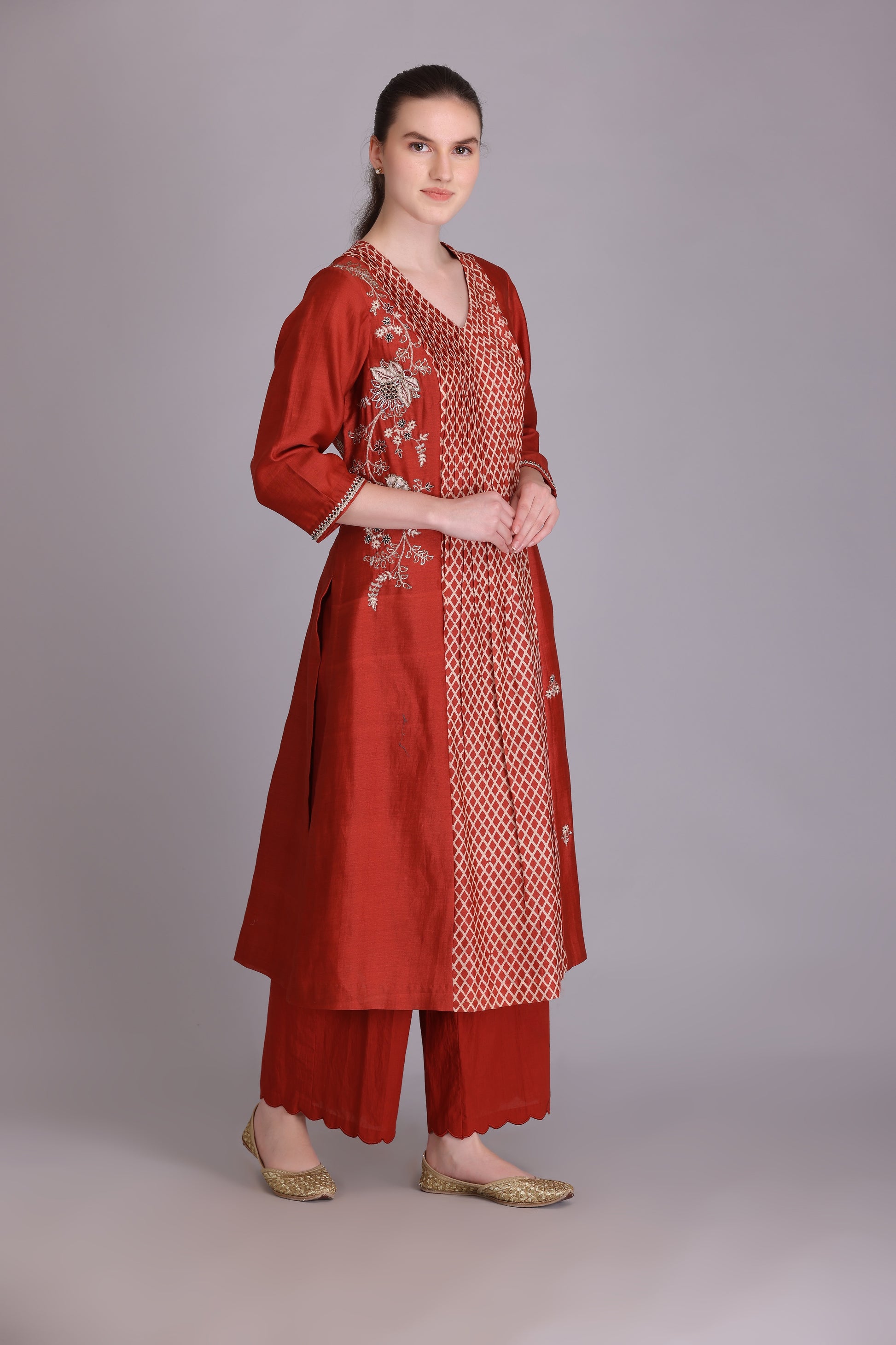 RUST SILK CHANDERI GEOMETRIC PRINT WITH PITTA EMBROIDERED PIN-TUCK KURTA COMES WITH MATCHING COTTON SCALLOP PLAZZO & RUST SILK CHANDERI EMBROIDERED DUPATTA WITH TASSELS