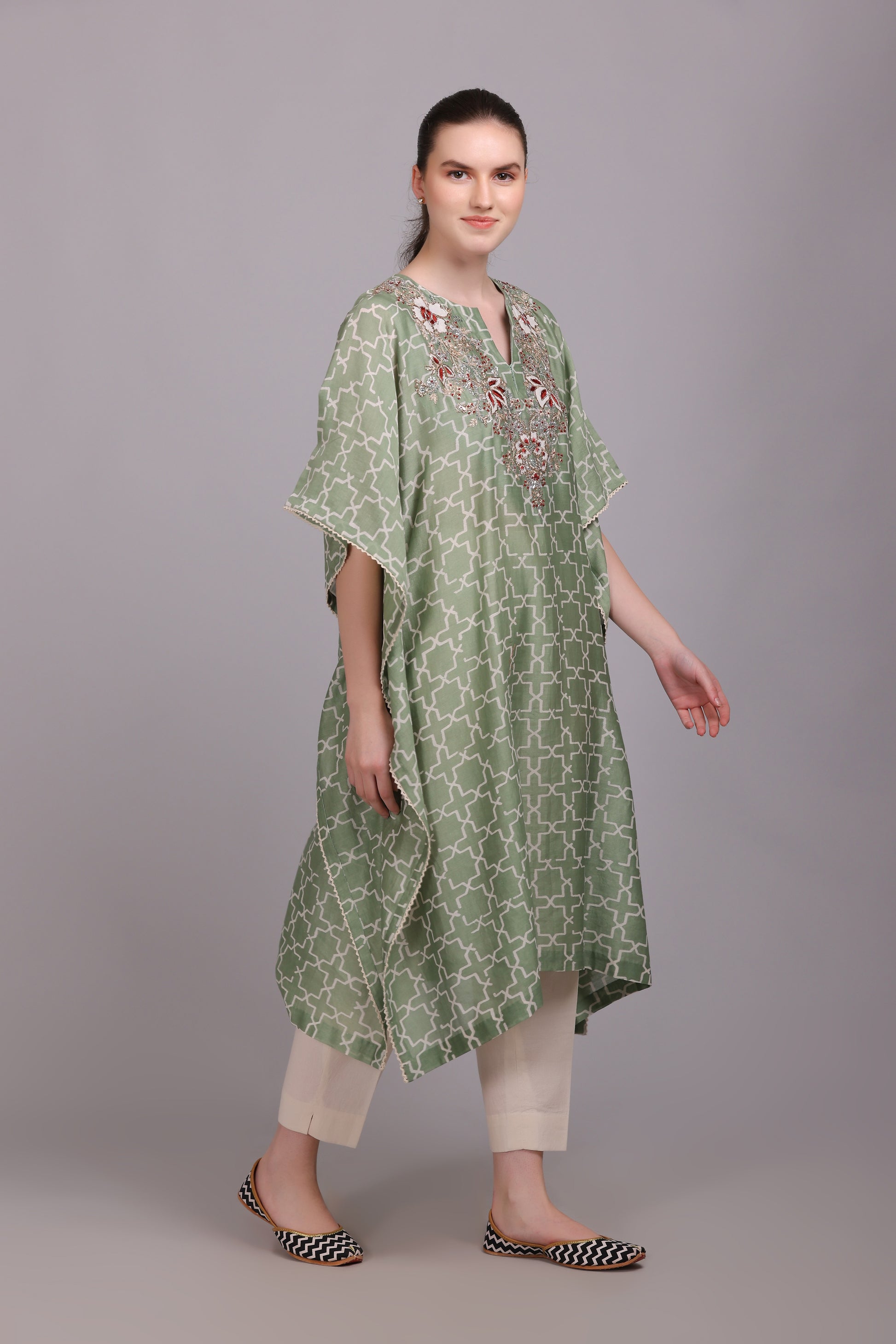 SAGE GREEN SILK CHANDERI KAFTAAN WITH PITTA EMBROIDERY WITH MATCHING COTTON IVORY PANT