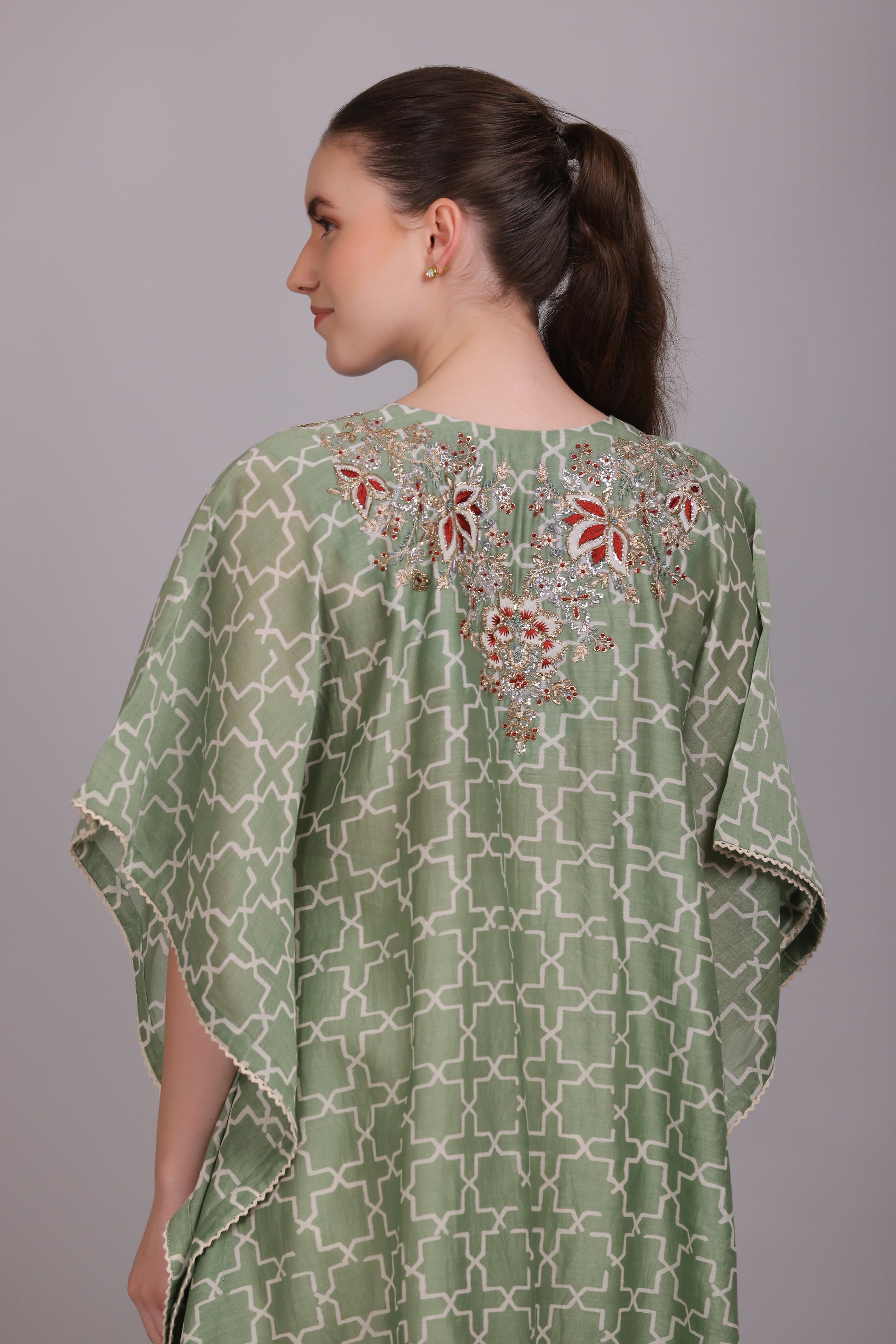 M6-10A SAGE GREEN GEOMETRIC PRINT PITTA EMBROIDERED KAFTAAN SET
