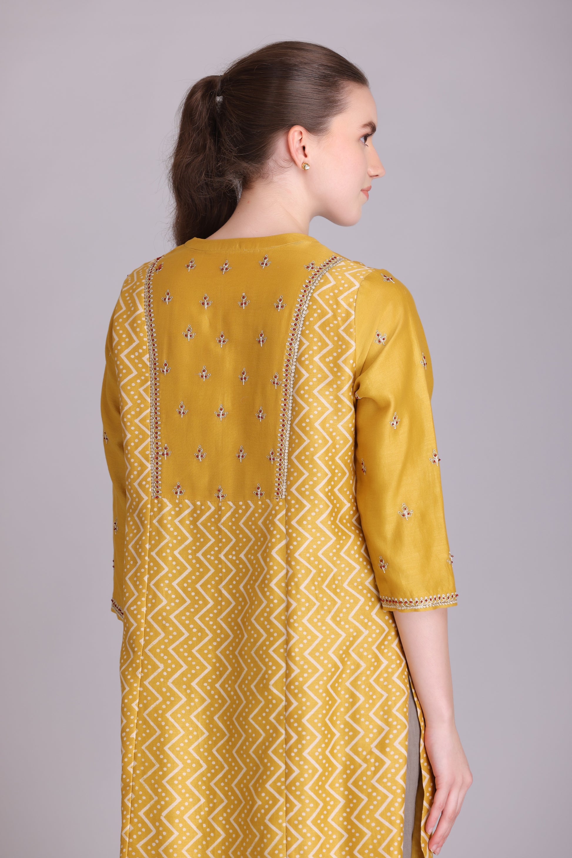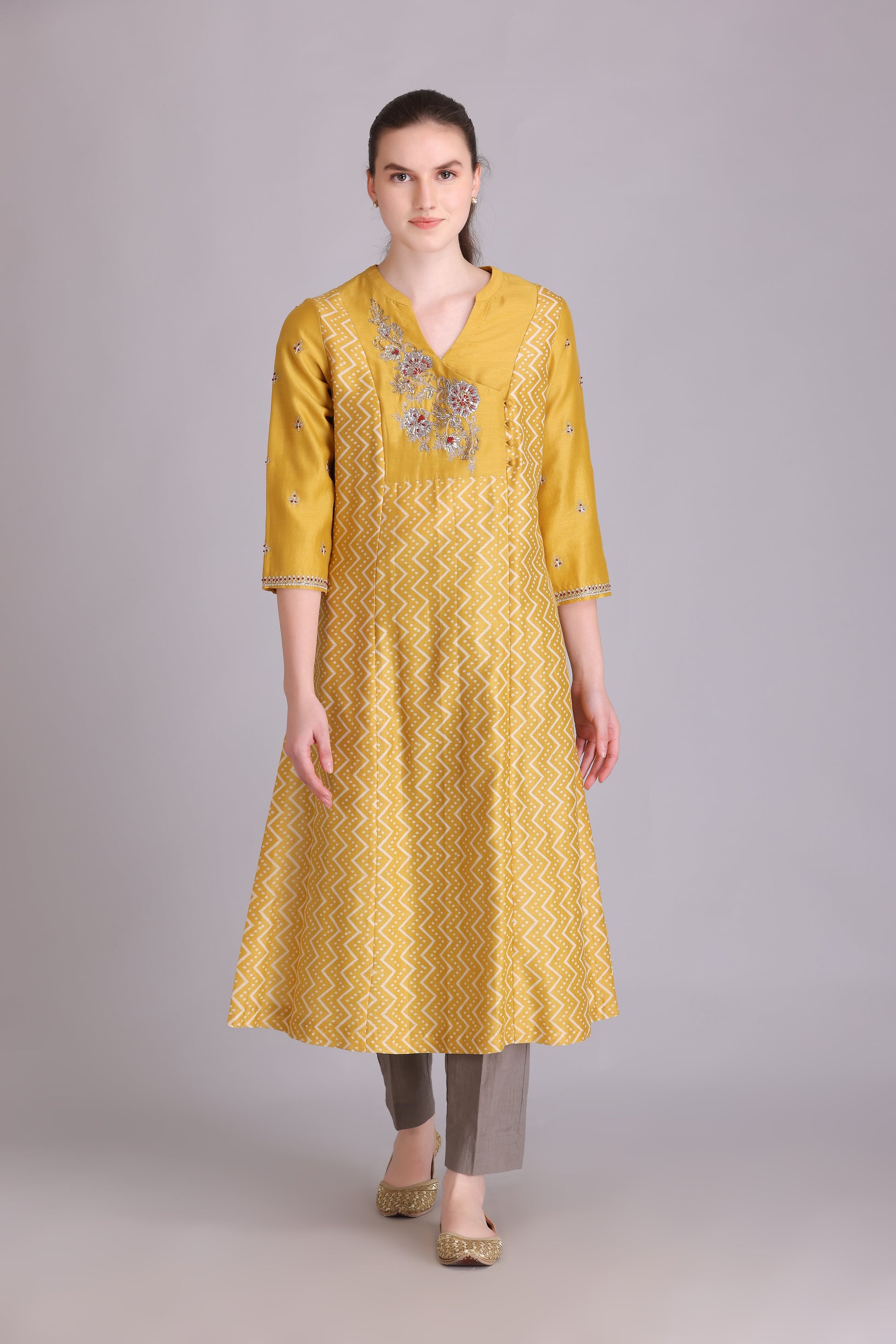 YELLOW SILK CHANDERI PITTA EMBROIDERED A-LINE KURTA PAIRED WITH GRAY COTTON PANTS & GRAY CHANDERI EMBROIDERED DUPATTA WITH TASSELS