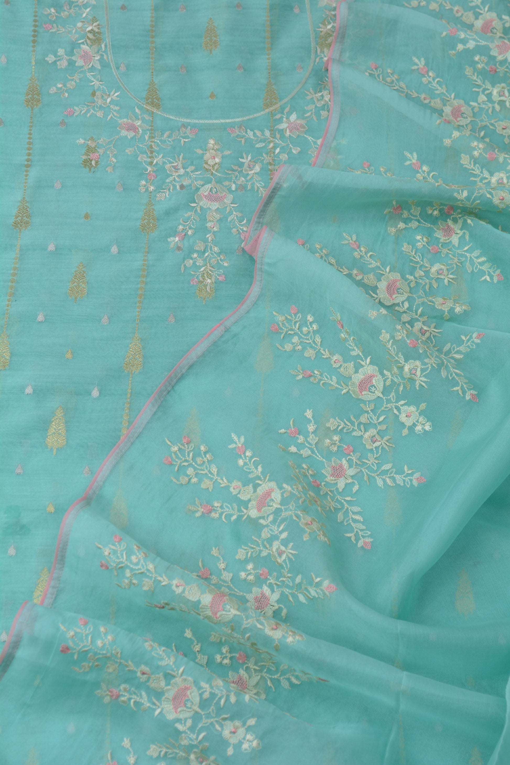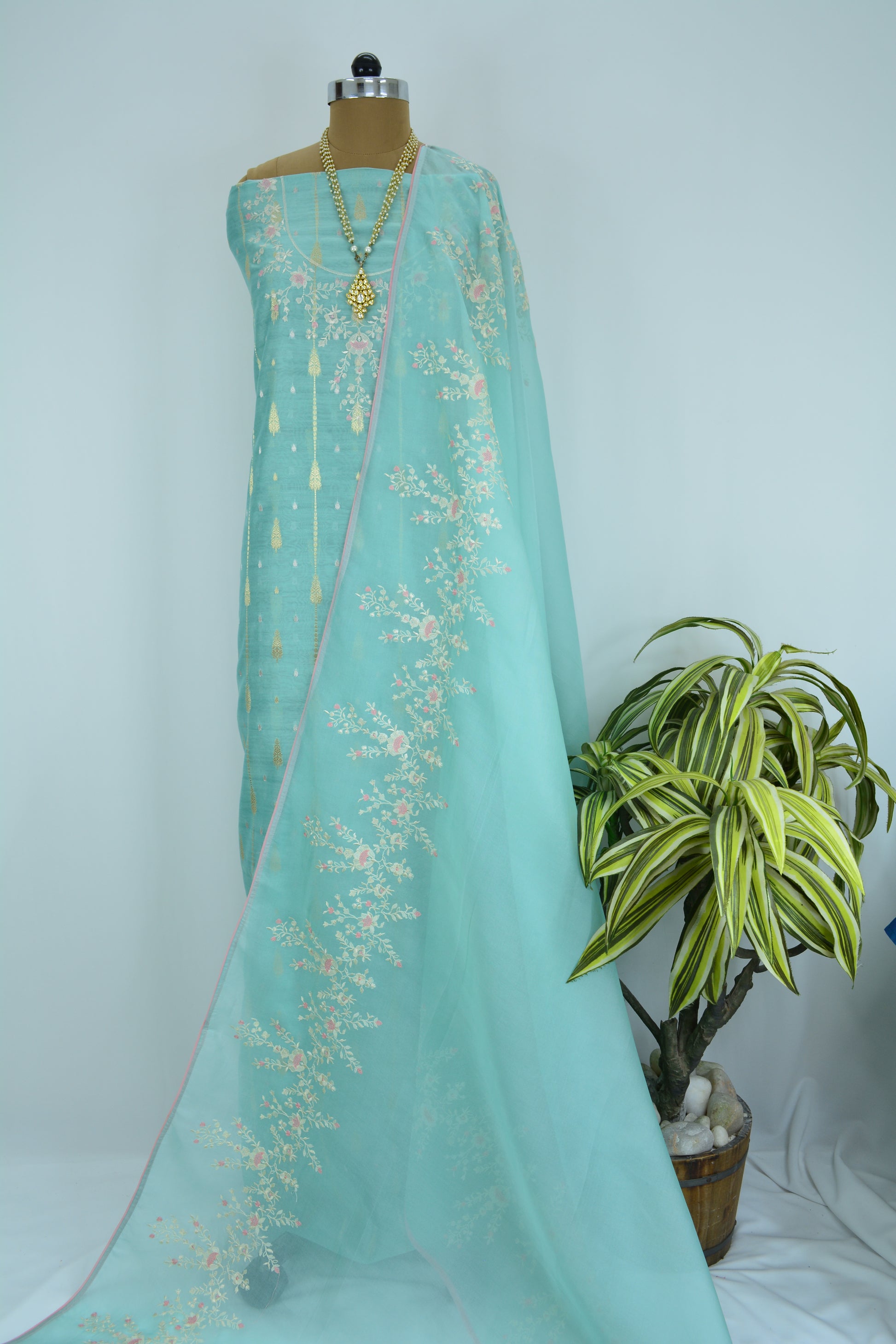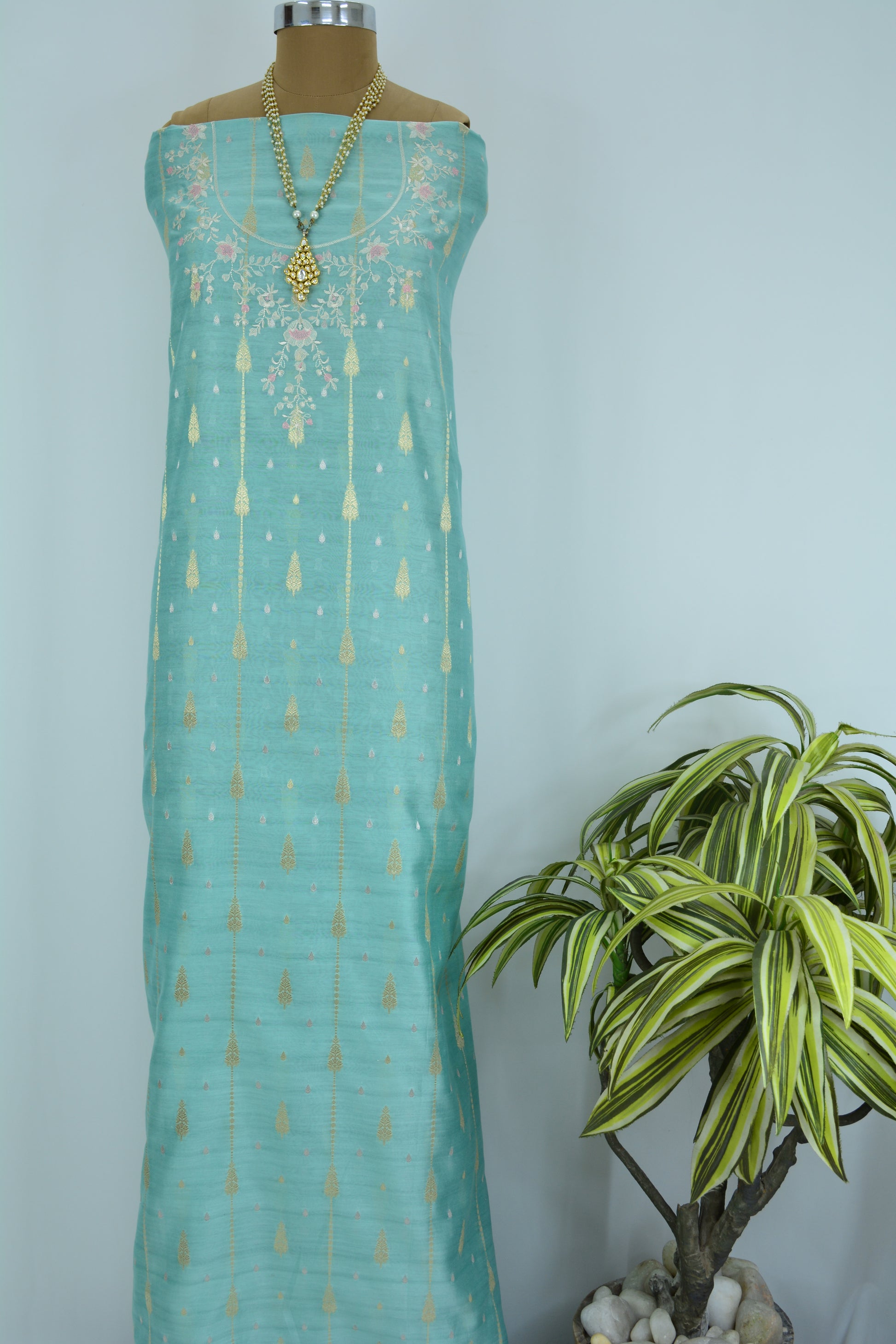 PREMIUM CHANDERI SHIRT WITH ZARI WOVEN BOOTI ALLOVER AND THREAD NECK EMBROIDERY TEAMED UP WITH BEAUTIFUL ORGANZA EMBROIDERED DUPATTA AND PURE CHANDERI MATCHING BOTTOMS 🌸