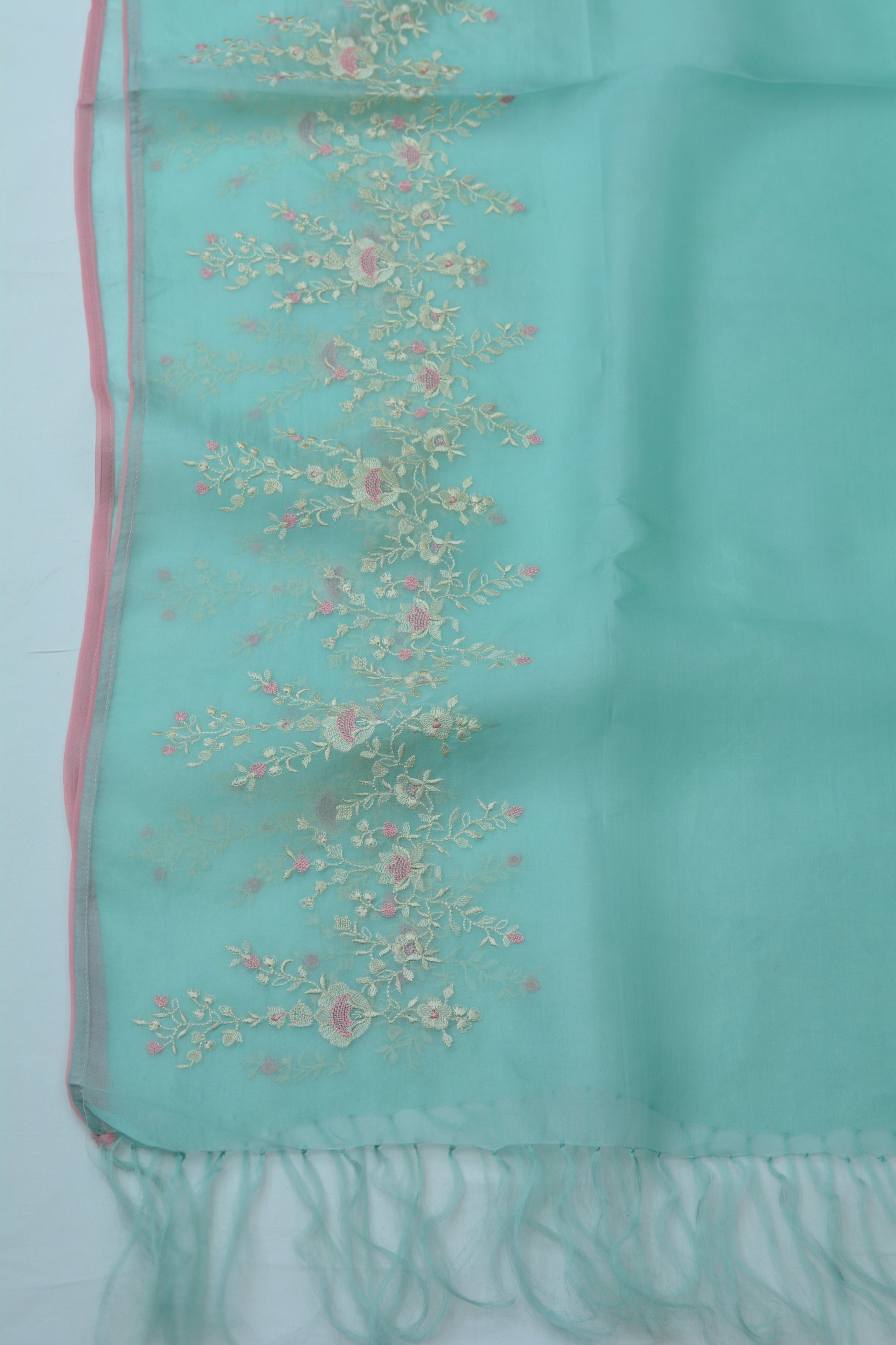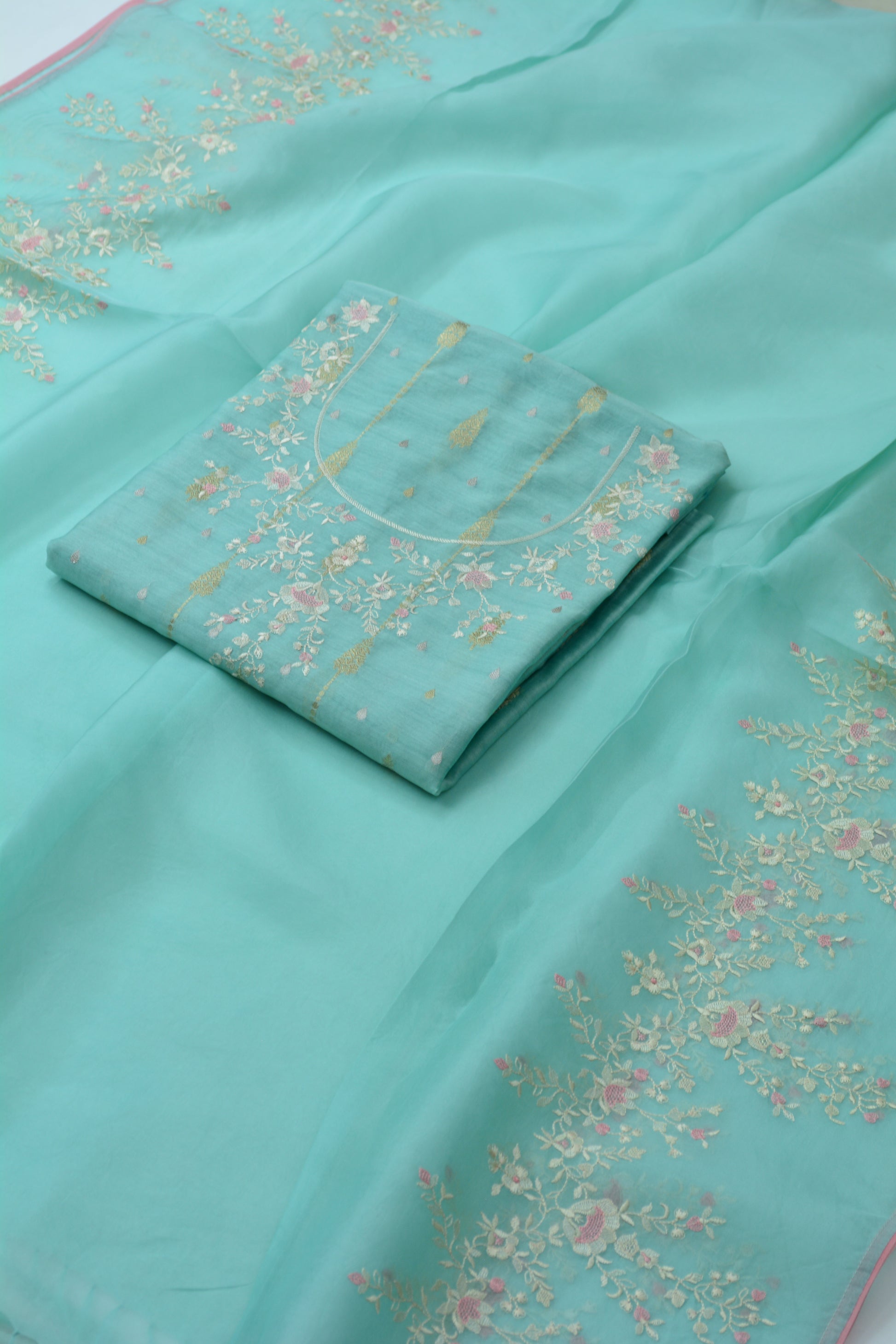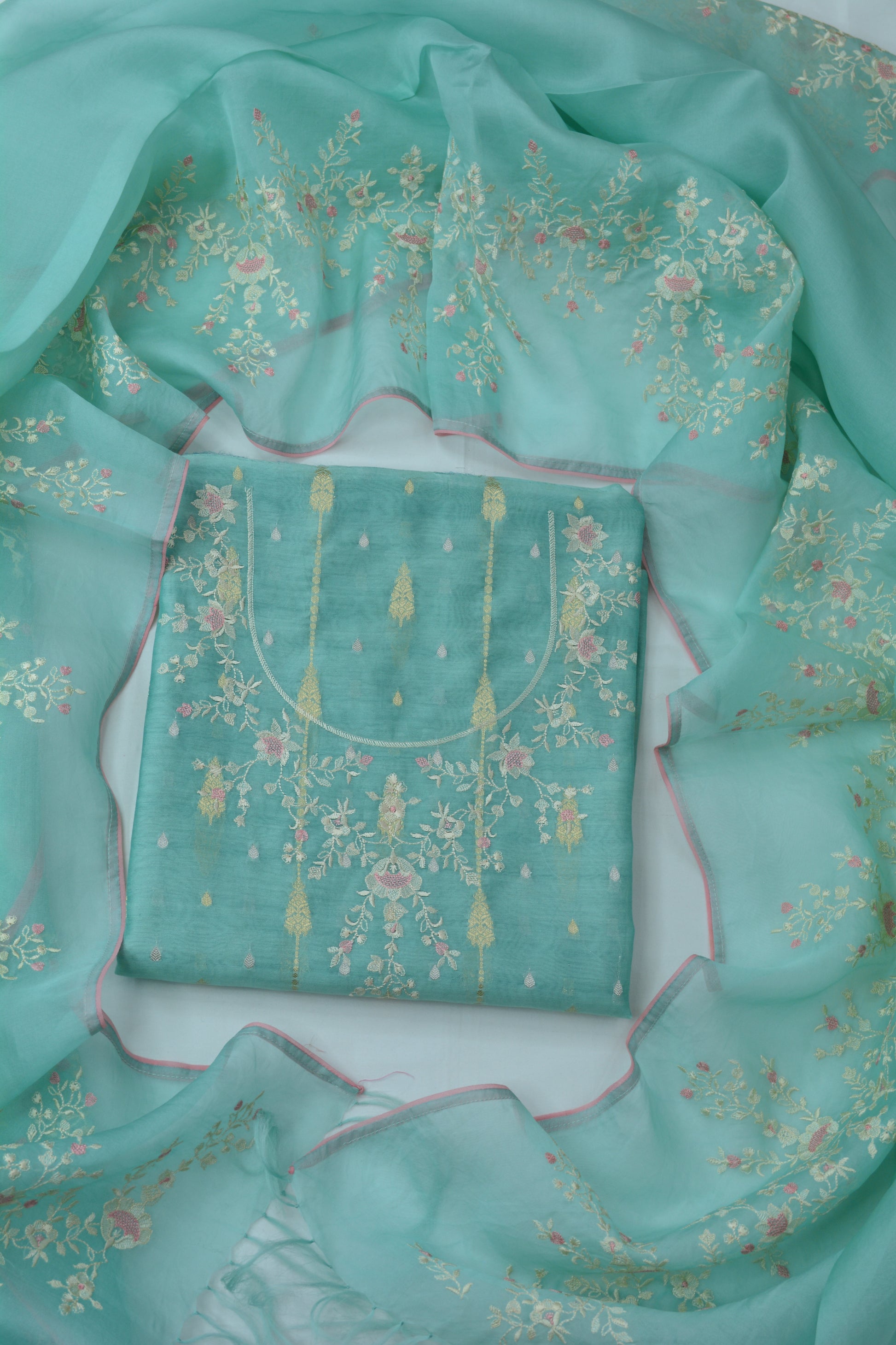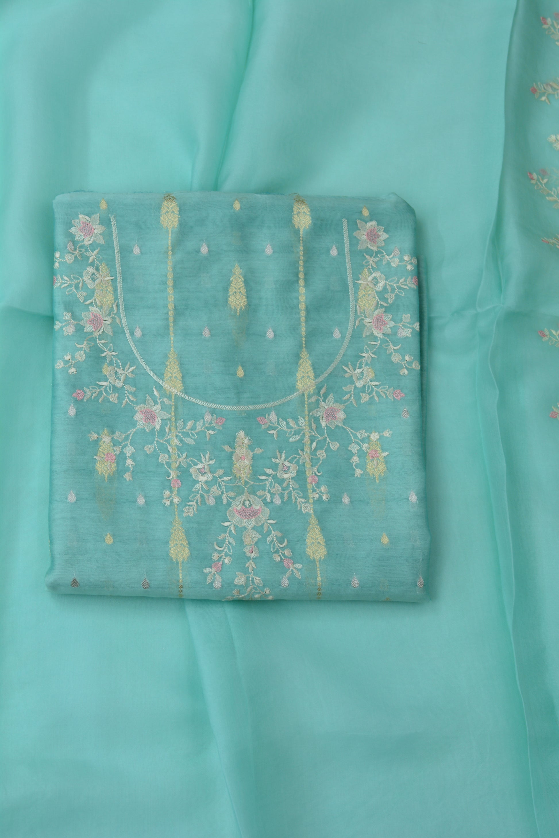 PREMIUM CHANDERI SHIRT WITH ZARI WOVEN BOOTI ALLOVER AND THREAD NECK EMBROIDERY TEAMED UP WITH BEAUTIFUL ORGANZA EMBROIDERED DUPATTA AND PURE CHANDERI MATCHING BOTTOMS 🌸