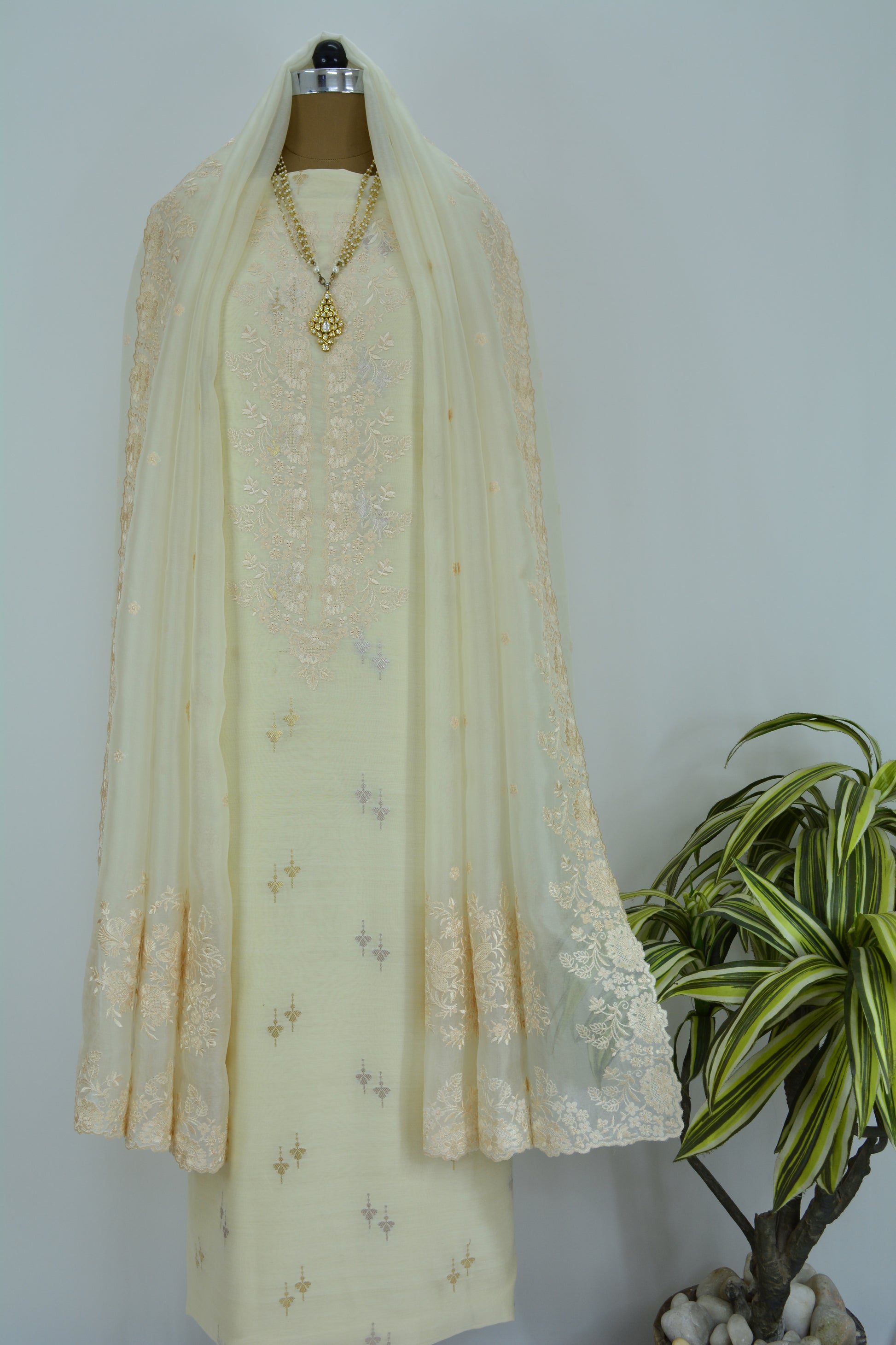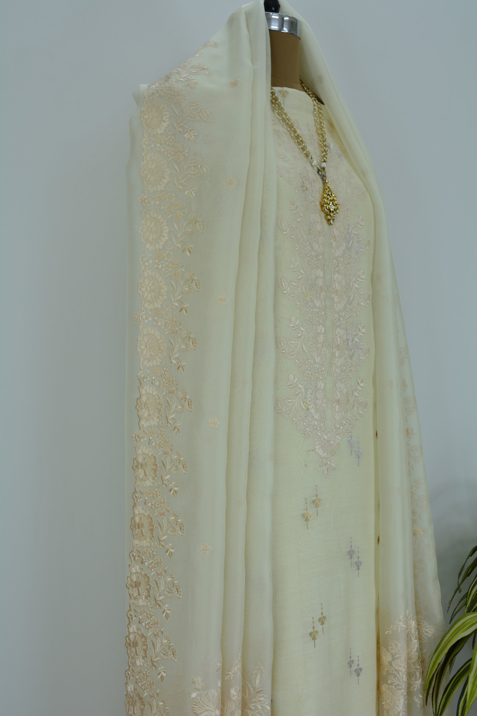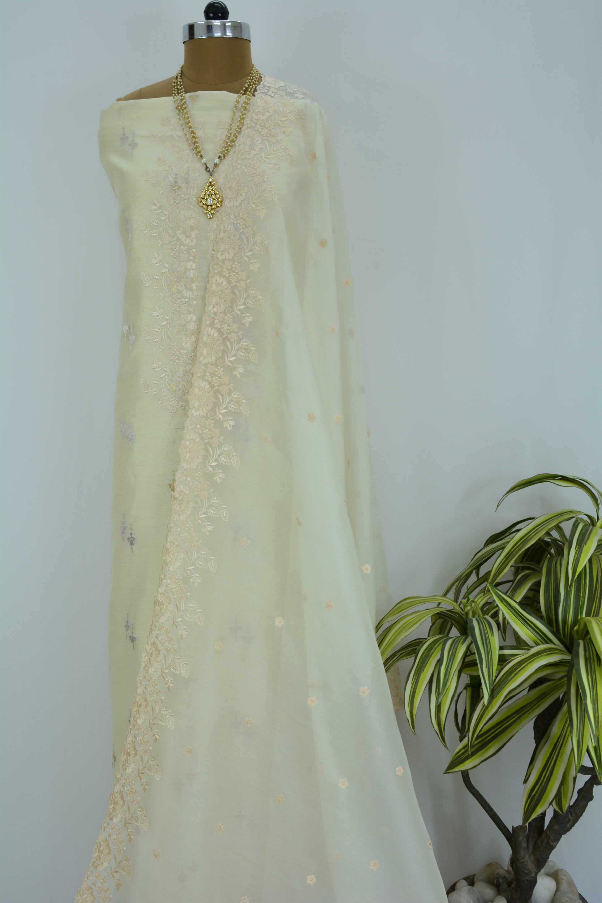 PREMIUM CHANDERI WOVEN SHIRT WITH PARSI THREAD EMBROIDERY, TEAMED UP WITH AN EMBROIDERED ORGANZA DUPATTA AND MATCHING CHANDERI BOTTOM.