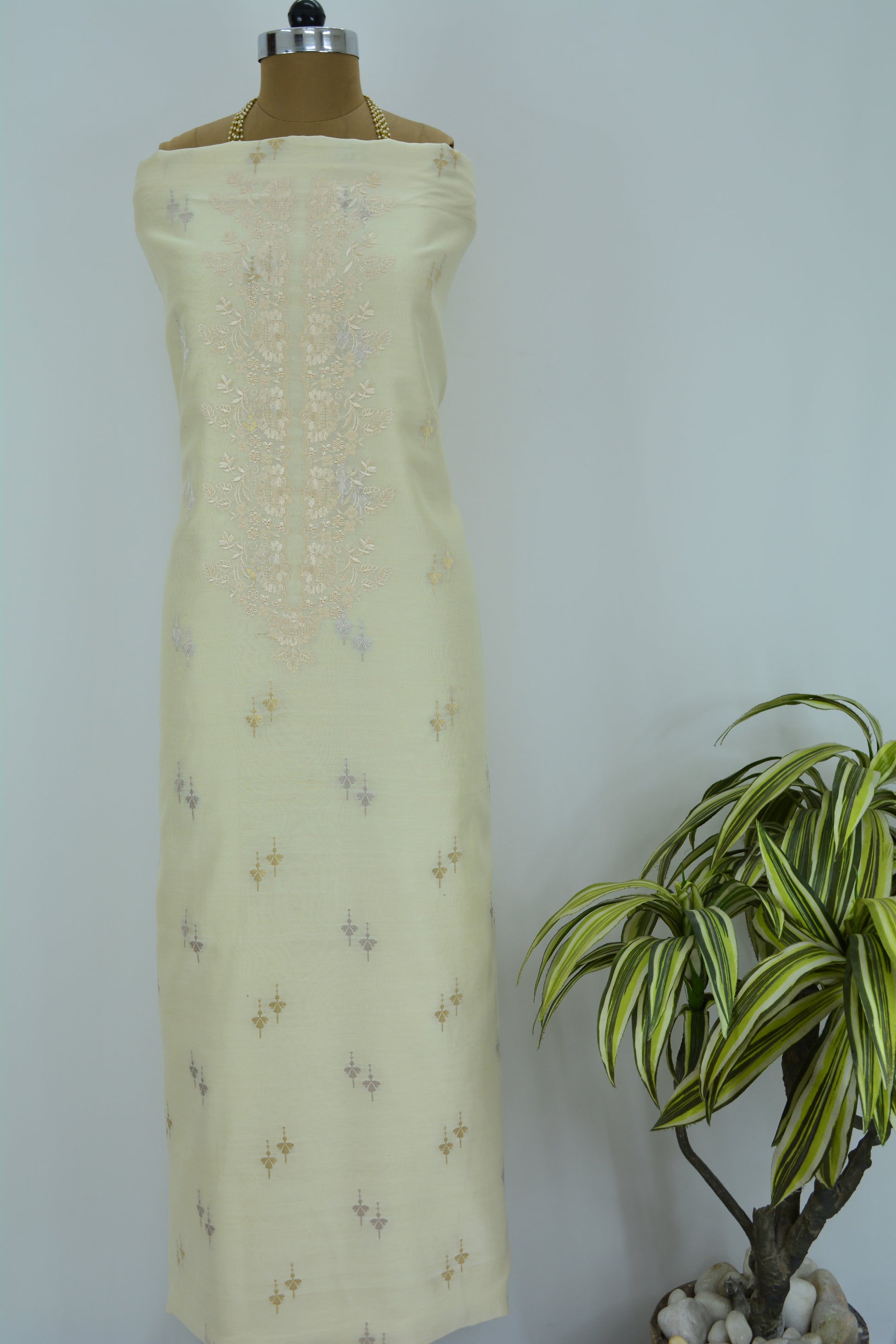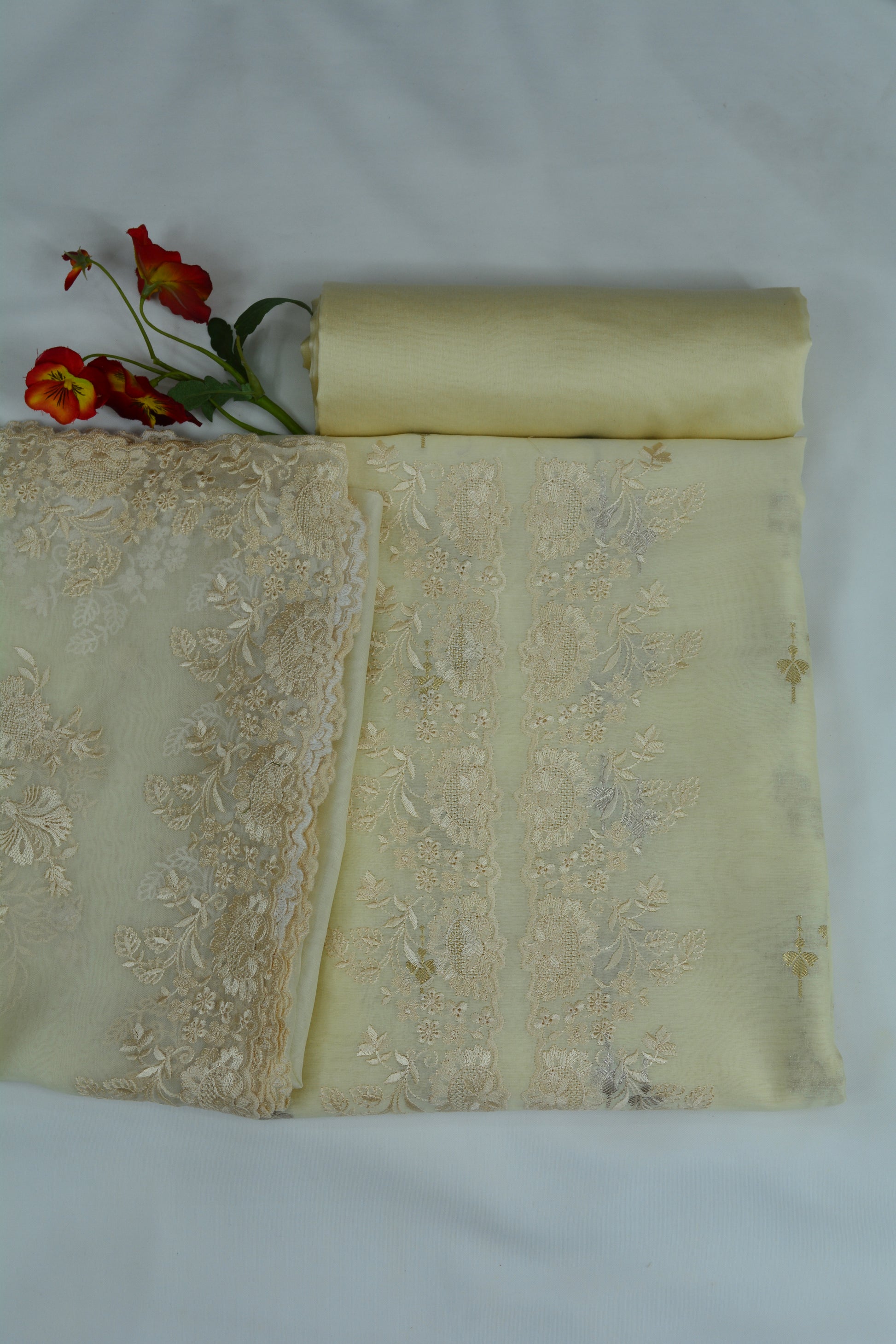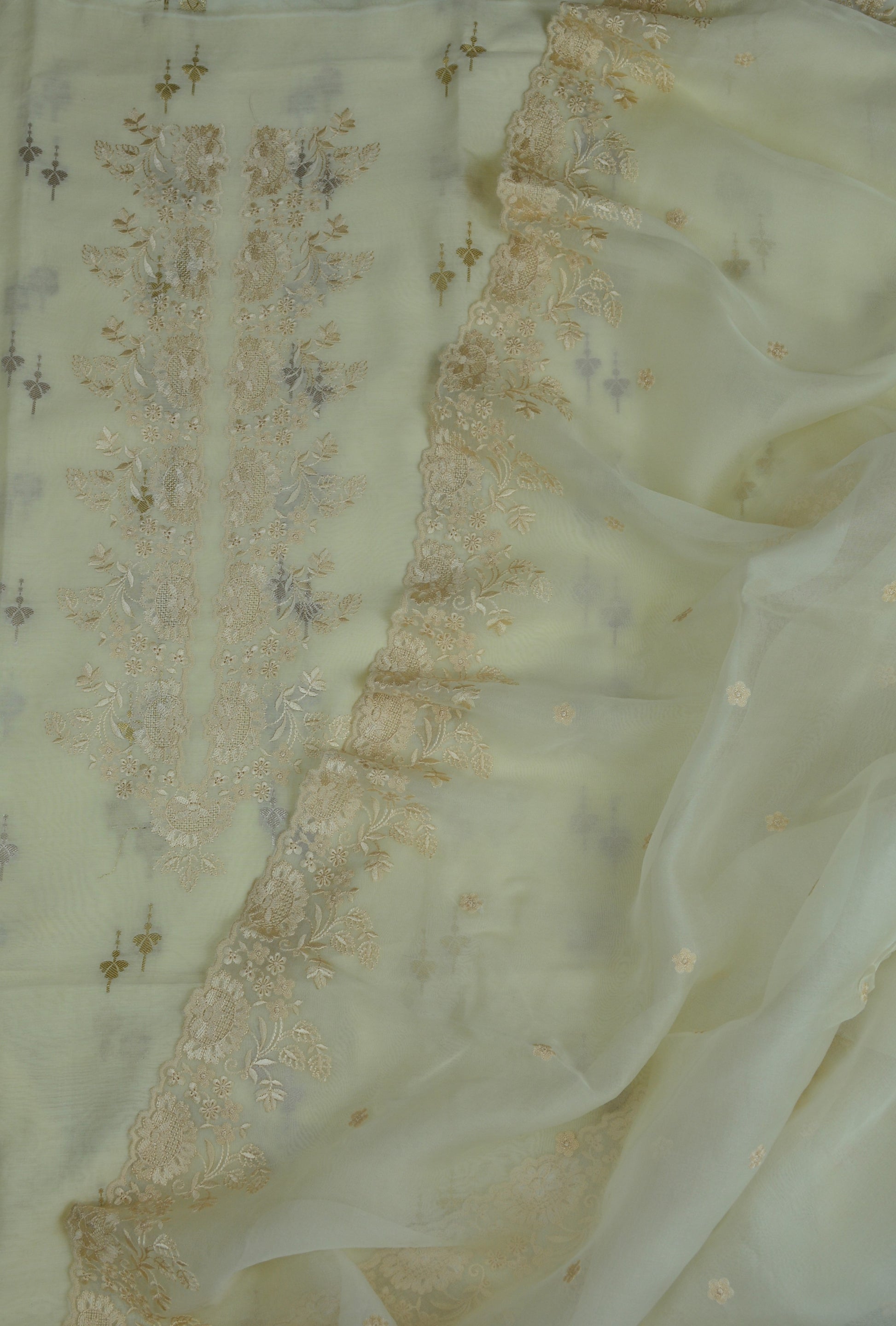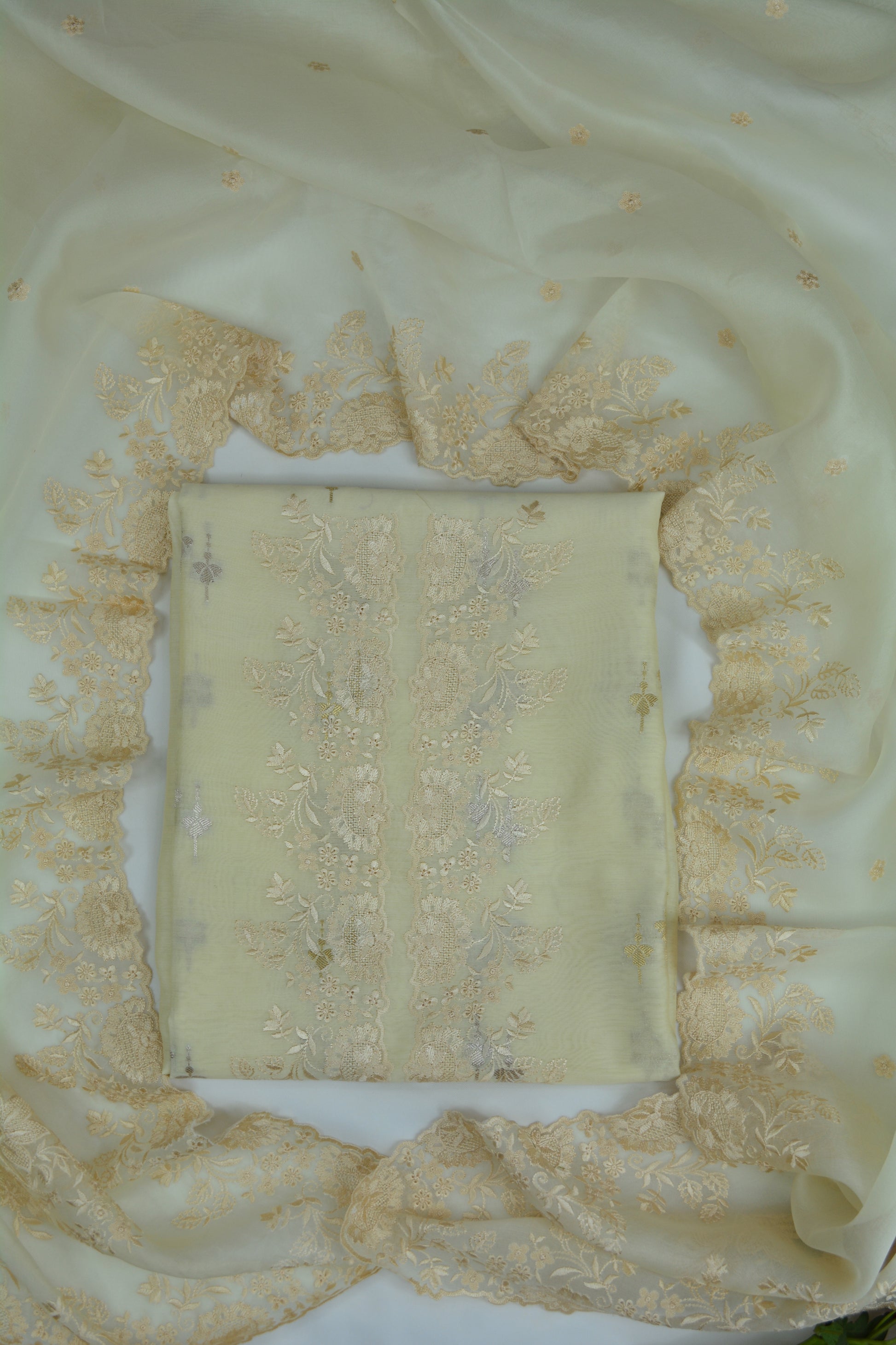 PREMIUM CHANDERI WOVEN SHIRT WITH PARSI THREAD EMBROIDERY, TEAMED UP WITH AN EMBROIDERED ORGANZA DUPATTA AND MATCHING CHANDERI BOTTOM.