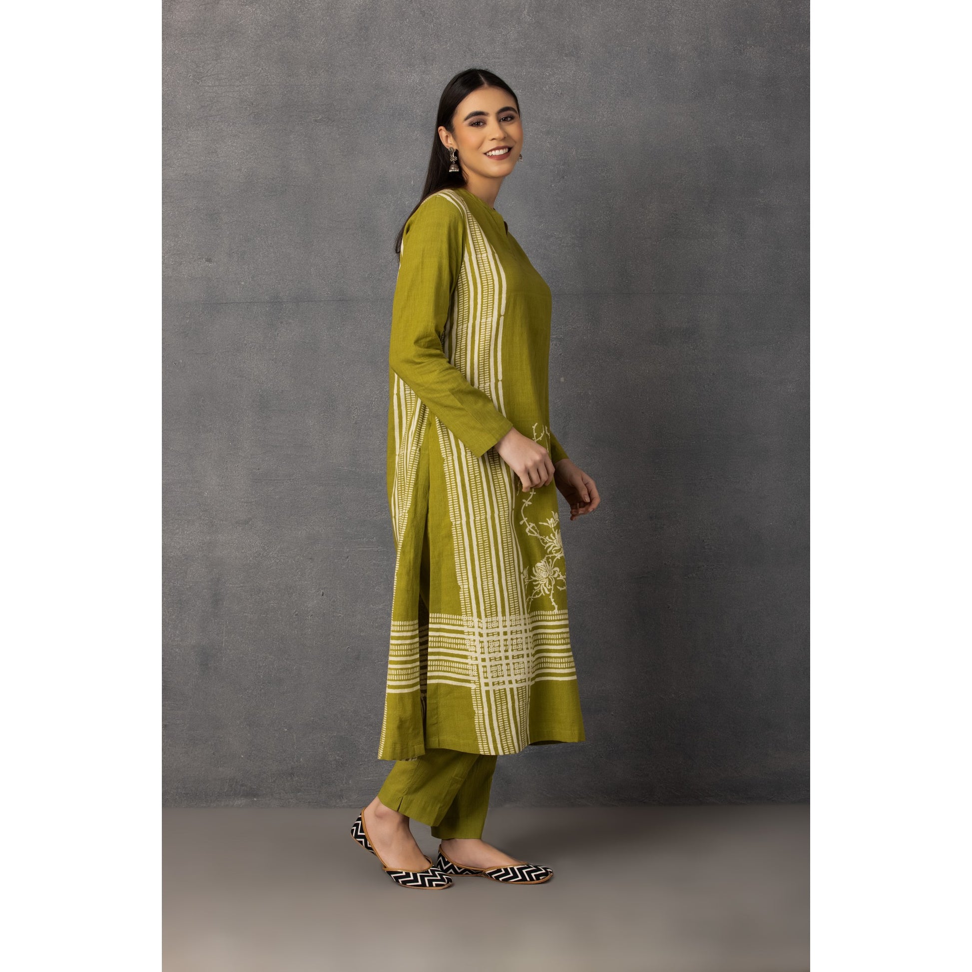 MEHNDI GREEN ORGANIC KHADI COTTON PRINTED KURTA AND SOFT MOTIFS TEAMED UP WITH ORGANIC COTTON PANTS.