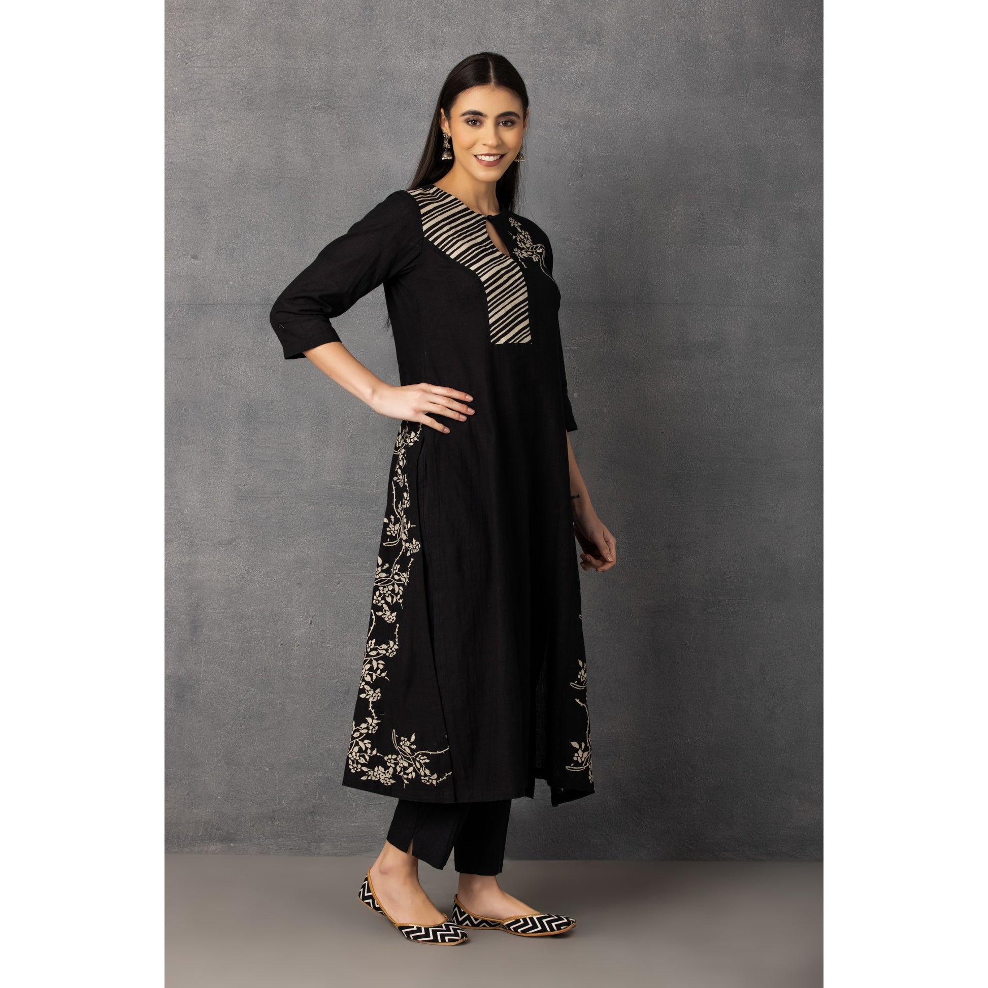 BLACK ORGANIC KHADI COTTON PRINTED A-LINE KURTA AND SOFT MOTIFS TEAMED UP WITH ORGANIC COTTON PANTS.