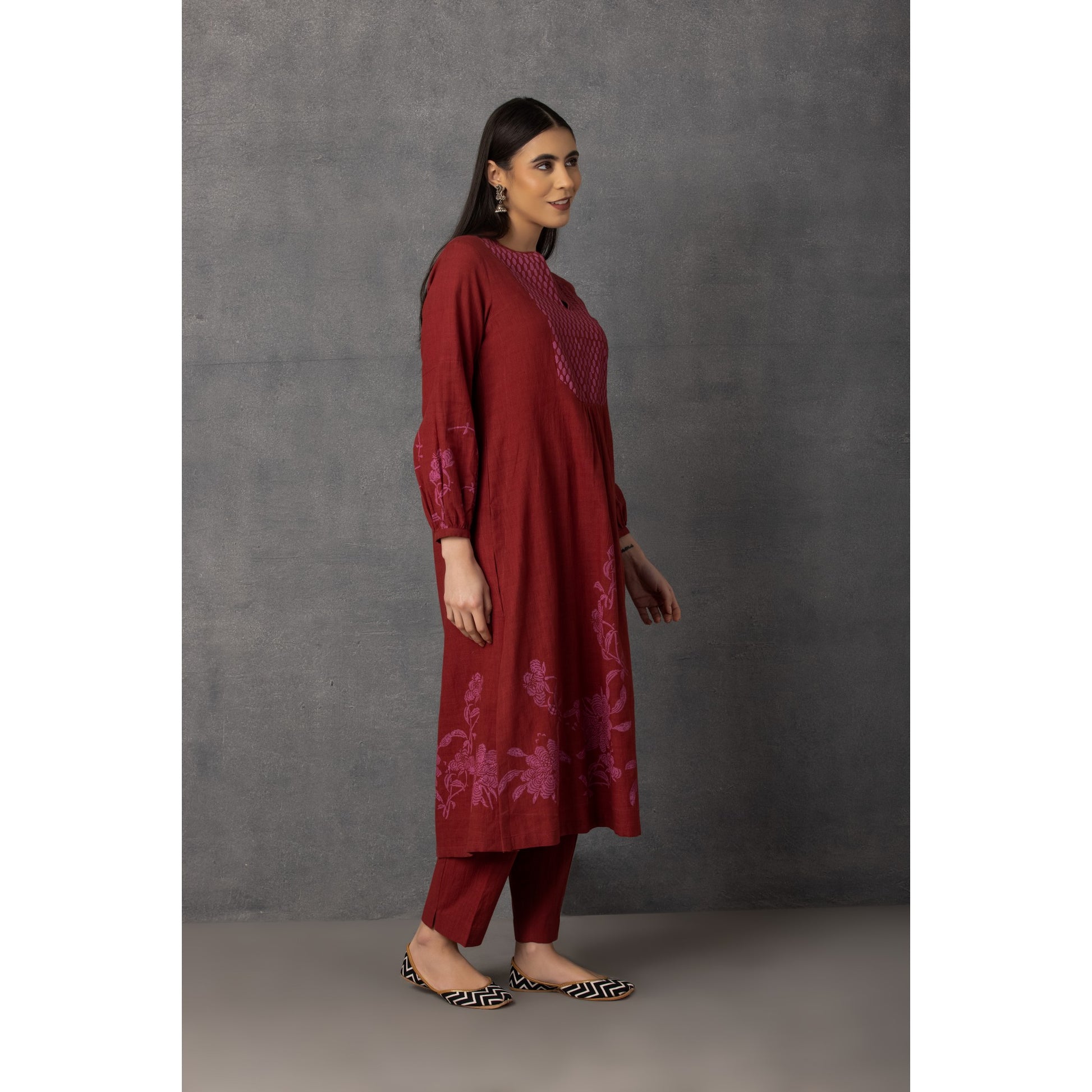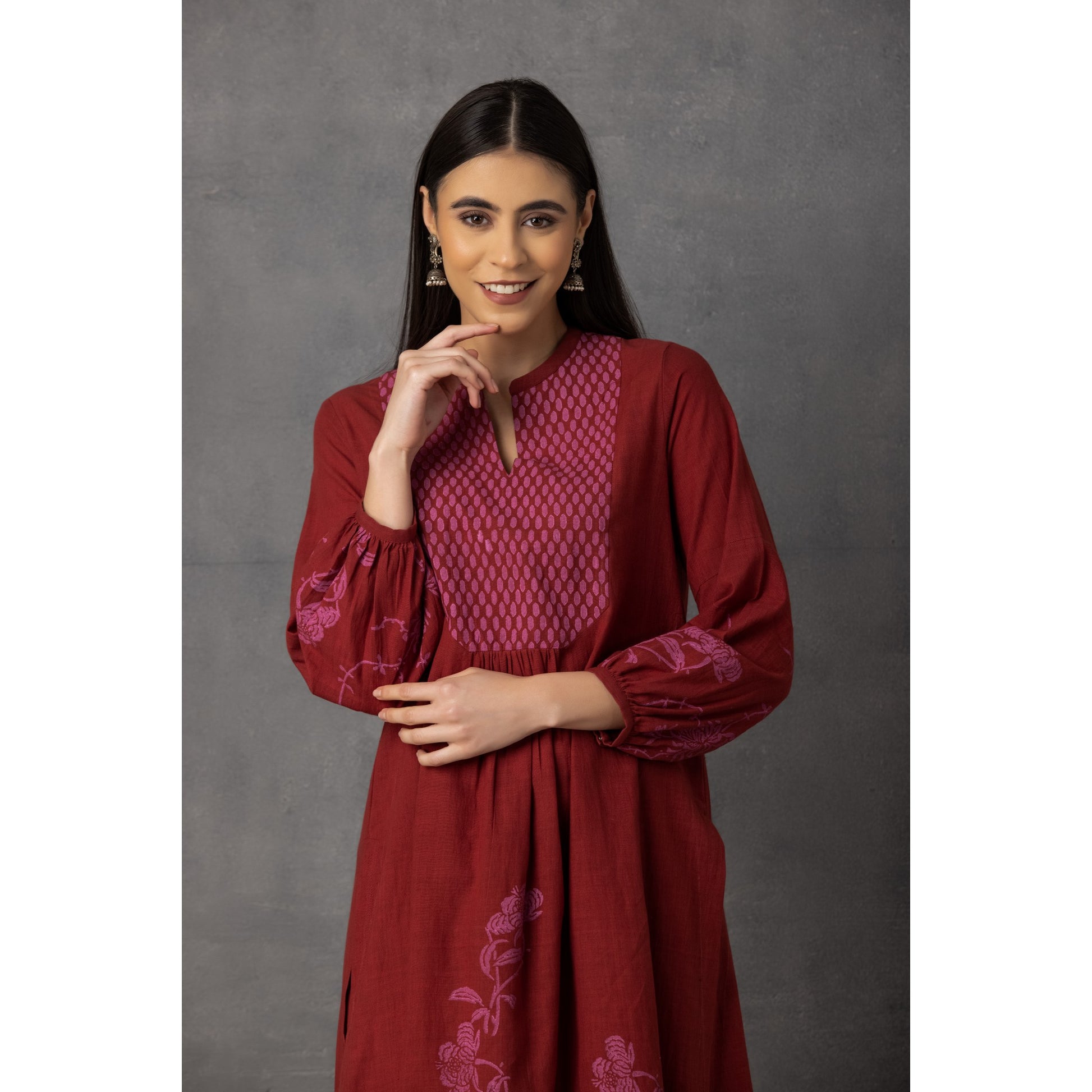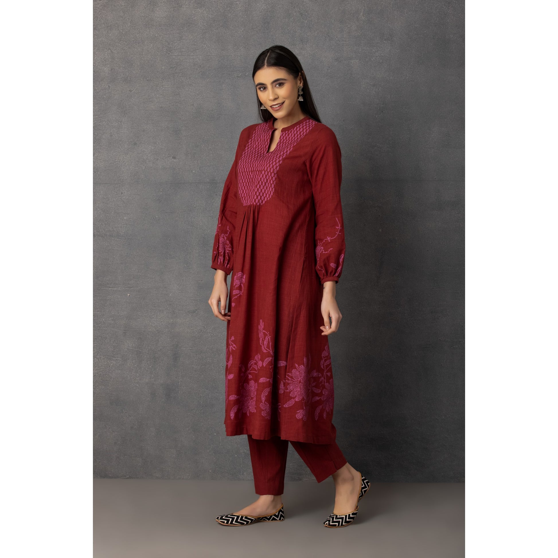 MAHROON ORGANIC KHADI COTTON PRINTED A-LINE KURTA AND SOFT MOTIFS TEAMED UP WITH ORGANIC COTTON PANTS.