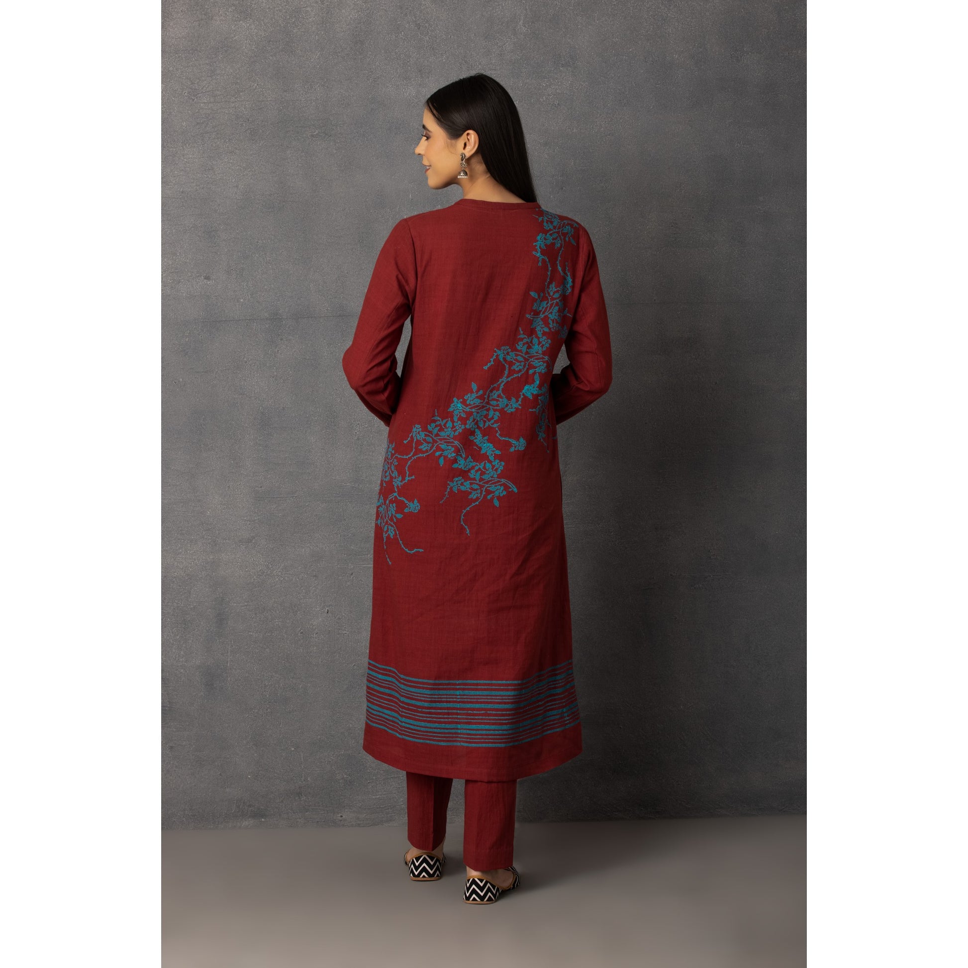 MAHROON ORGANIC KHADI COTTON PRINTED A-LINE KURTA AND SOFT MOTIFS TEAMED UP WITH ORGANIC COTTON PANTS.