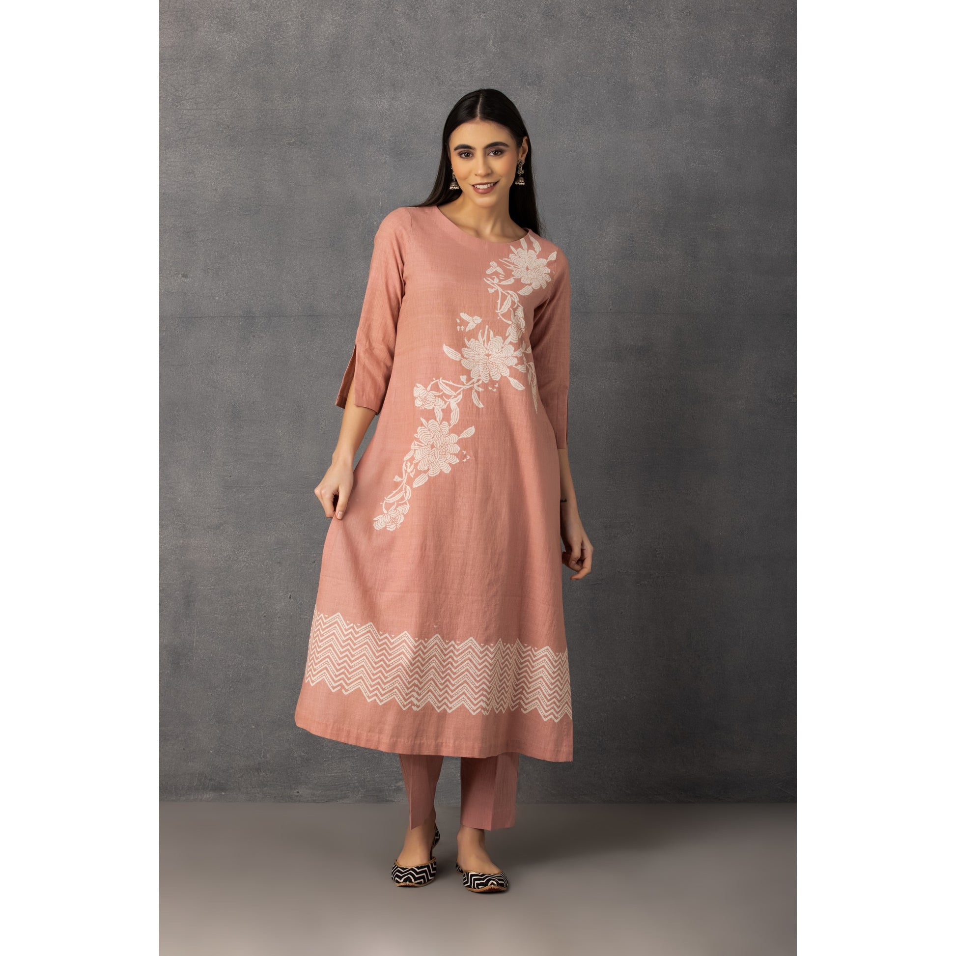 ROSE PINK ORGANIC KHADI COTTON PRINTED A-LINE KURTA AND SOFT MOTIFS TEAMED UP WITH ORGANIC COTTON PANTS.