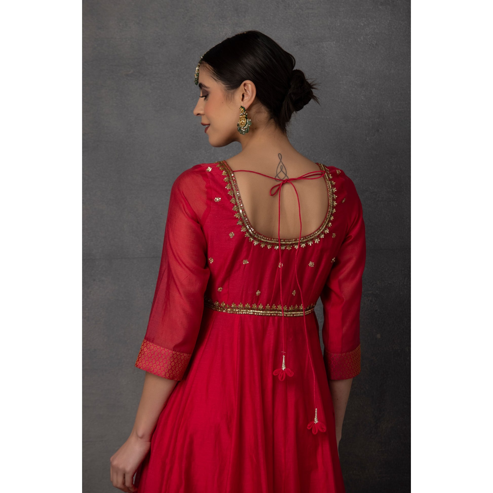 RED EMBROIDERED CHANDERI ANARKALI WITH INTRICATE HANDWORK ON THE FRONT AND BACK YOKE, ACCENTED WITH BROCADE HEMLINE, PAIRED WITH A MATCHING GEORGETTE DUPATTA AND CHURIDAR.